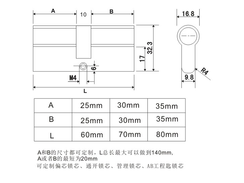 鎖芯長度常規(guī)為:60、70、75、80mm,其它長度根據(jù)需要定做